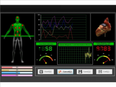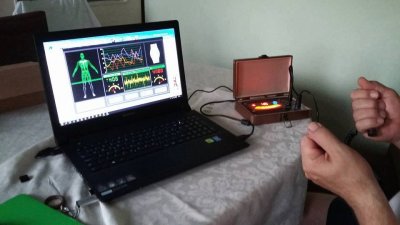 ![]() Konačno, kompletan test se analizira od strane stručnog lica. Na primjer kancerogene stanica su drugačije od normalnih stanica. Ako je povećana koncentracija kancerogenih stanica u ljudskom organizmu, rezonanca će izvršiti test i istrument će detketirati signal. Što više kancerogenih stanica ima u organizmu signal će biti intezivniji a kvantni rezultat teži ka negativnoj vrijednosti. Ako nema značajnog broja kancerogenih stanica, rezonanca neće zabilježiti promjene i rezultat će biti pozitivan.
