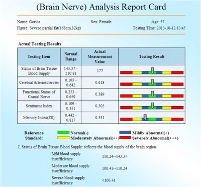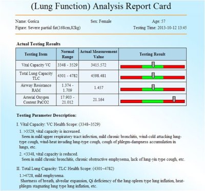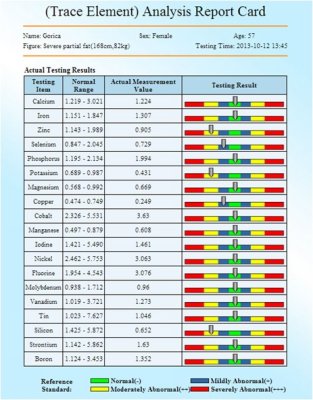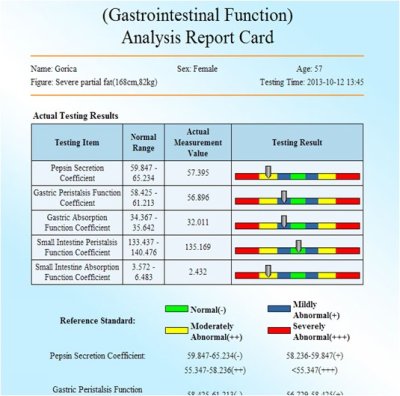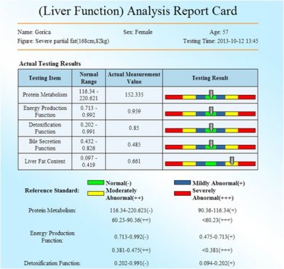 ![]() Analizom ovim uređajem može da se utvrdi zdravsteno stanje osobe a takođe ovi testovi mogu da odrede koji nutitivni parametri treba da se poboljšaju da bi se popravilo kompletno stanje organizma. Ovaj uređaj takođe može da se koristi za praćenje pojedinih terapija i u svrhu prilagođavanja terapije zahtjevima stanja pojedinca.